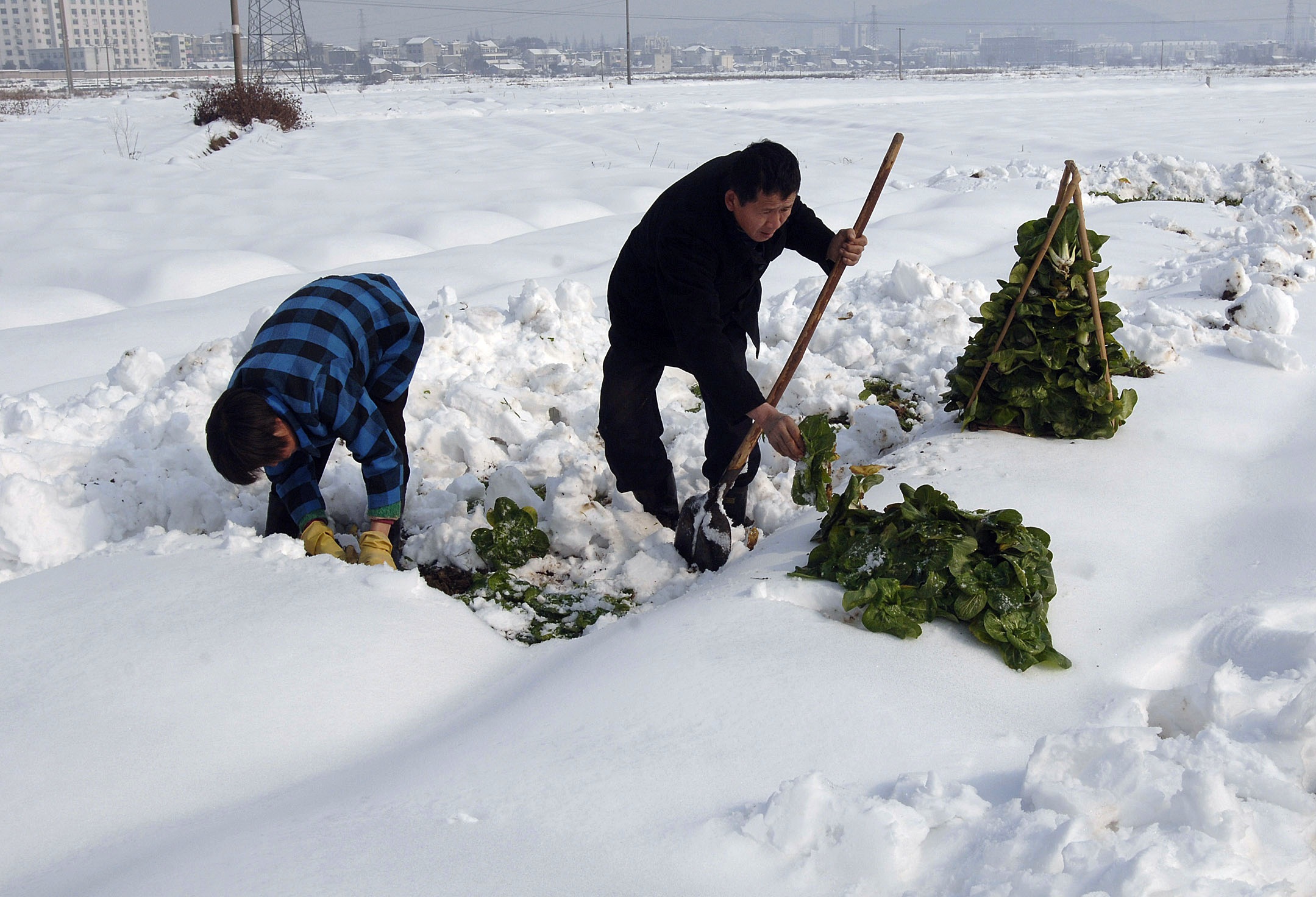 | Farmers dig out vegetables from a snow-covered field in Wuhu, Anhui province, February 3, 2008. The worst winter weather to hit central, eastern and southern China in decades could persist into the Year of the Rat, weather officials said. [Agencies] |