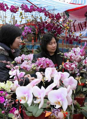 Local residents choose flowers at the New Year Fair held at the Victoria Park in Hong Kong, South China, Feb. 3, 2008. [Xinhua]