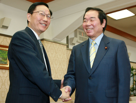Chinese Finance Minister Xie Xuren (L) shakes hands with Japan's Finance Minister Fukushiro Nukaga at the latter's office in Tokyo, February 10, 2008. [Xinhua]
