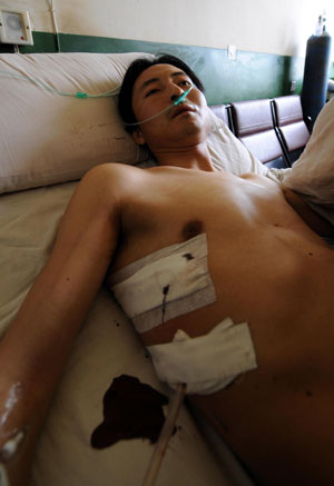 Ma Gubei is treated in a hospital in Lhasa in this March 16, 2008 photo. Ma was delivering food to hospital patients on March 14 when he was attacked by rioters and his motorbike was burnt. [Xinhua]
