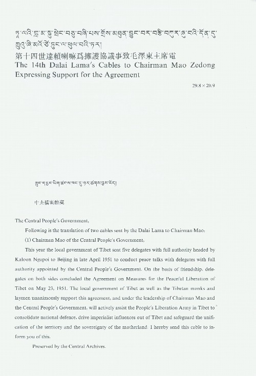 A telegraph sent by the 14th Dalai Lama to Chairman Mao Zedong in October 1951, in which he expressed his support for the agreement on measures of the peaceful liberation of Tibet. [china.org.cn]