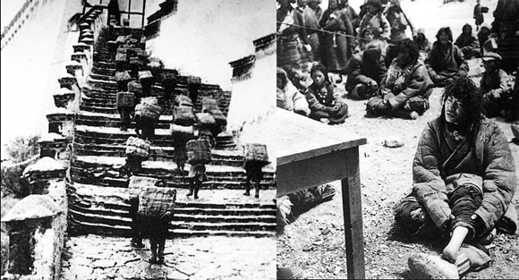 Left: Serfs carry goods to the Potala Palace. Right: A herdsman's left foot was chopped by the head of his tribe. File photo