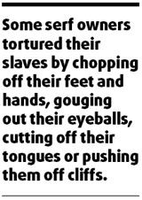 Some serf owners tortured their slaves by chopping off their feet and hands, gouging out their eyeballs, cutting off their tongues or pushing them off cliffs.