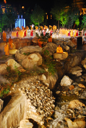 A music ritual entitled "Zen Shaolin" is staged in the Daixian Valley of the Songshan Mountain, near the Shaolin Temple in Central China's Henan Province, April 20, 2008. [Chinadaily.com.cn]
