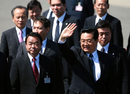Chinese President Hu Jintao waves upon his arrival at Tokyo's Haneda airport May 6, 2008. Hu began his five-day "warm spring" trip to Japan, aimed at boosting the strategic and mutually beneficial relationships between the two countries. [Xinhua]