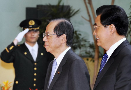 Chinese President Hu Jintao (R) is welcomed by Japanese Japanese Prime Minister Yasuo Fukuda (2nd R) upon his arrival at the latter's official residence in Tokyo May 7, 2008. Hu is on a five-day state visit to Japan. [Agencies] For More Photos