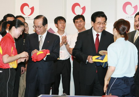 Chinese President Hu Jintao (second right) and Japanese Prime Minister Yasuo Fukuda (second left) talk with Japanese table tennis player Ai Fukuhara (right) and Chinese table tennis player Wang Nan (left) after they sign autographs of them during the opening ceremony of the 2008 Japan-China youth friendly exchange year at the Waseda University in Tokyo, capital of Japan, May 8, 2008. [Xinhua]