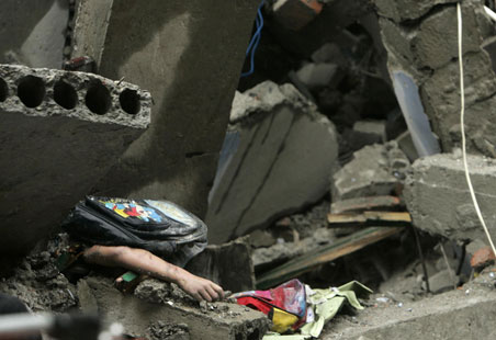 An arm of a victim is seen amidst the debris of a collapsed building after an earthquake in Dujiangyan, Sichuan province May 13, 2008. [Agencies]