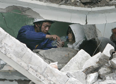 High-school student Yang Liu (R) is given a bottle of water by a rescuer as her legs are trapped under concrete in the rubble of a collapsed school in the township of Hanwang in Mianzhu city in Sichuan province May 14, 2008. Yang has been fed, given water and a white helmet as workers remove ruins brick by brick from around her and a crane pulled away slabs of concrete -- the remains of the school that parents said had around 800 students before Monday's quake hit. In front of Yang lies a dead body. [Agencies]