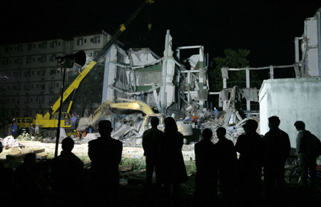 Residents watch as rescuers work at the rubble of a collapsed high school in the township of Hanwang in Mianzhu city in Sichuan province late May 14, 2008. At least one survivor is seen trapped in the rubble. China poured more troops into the earthquake-ravaged province of Sichuan on Wednesday to speed up the search for survivors as time ran out for thousands of people buried under rubble and mud. [Agencies]