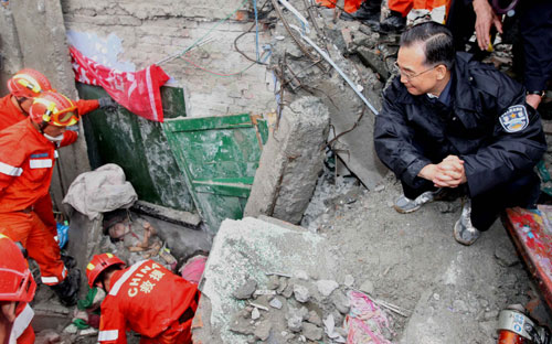 Audiences saw a tearful Wen on TV as well. The premier wept as he watched rescuers try to get two children out of the shattered remains of a primary school in Dujiangyan.