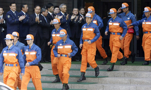 A Japanese rescue team leaves the Metropolitan Police Department in Tokyo as they head for China to take part in relief efforts in areas hit by Monday's devastating earthquake, May 15, 2008. [Agencies]