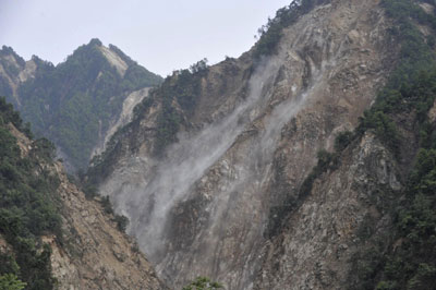 Rocks and sand roll down a slope during a landslide in the earthquake-hit Jinhua town of Mianzhu county, Sichuan province May 17, 2008. Fifty-six people were rescued from the town, a witness at the scene said. Picture taken May 17, 2008.[Agencies]