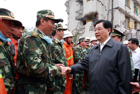 Chinese President Hu Jintao (R) shakes hands with a rescuer when he inspects disaster relief work in the quake-hit Xuankou Town of Wenchuan County, Southwest China's Sichuan Province, May 17, 2008. [Xinhua]