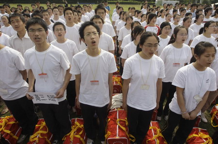 Students who survived when the earthquake hit Beichuan county stand to sing China's national anthem during a ceremony before resuming classes at a factory training centre in Mianyang, Sichuan province, May 19, 2008. [Agencies]