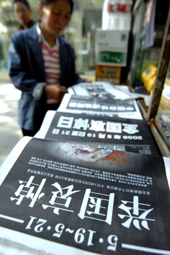 A citizen looks at bold-face front pages of newspapers in Zhengzhou, capital of central China's Henan Province, May 19, 2008. [Xinhua]
