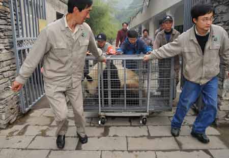 Workers carry giant pandas before transporting them to the Ya'an preservation zone, in the China Giant Panda Protection and Research Center based in Wolong which is only 30 kilometers from the epicenter of last week's 8.0-magnitude earthquake on Richter scale, southwest China's Sichuan Province, May 23, 2008. Eight other giant pandas from quake-hit Sichuan Province will be airlifted to Beijing on May 24 so that the animals can have a better breeding and recovery environment. [Xinhua]