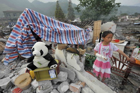 An injured child stands on the ruins of her collapsed house in earthquake-hit Shifang, Sichuan Province May 22, 2008. The death toll in China's major earthquake increased to 55,740 as Friday noon.[Agencies]