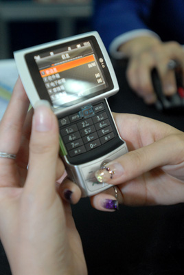 A customer tries a 3G mobile phone at a store in Shenyang, Northeast China's Liaoning Province, April 1, 2008. [Xinhua]