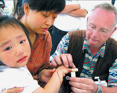 German doctor Joachim Gardemann checks a young girl's finger, which she injured in the quake, at a makeshift hospital in Dujiangyan, Sichuan province, May 25, 2008. [China Daily]