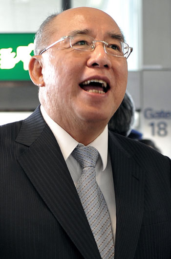 Taiwan's ruling Nationalist Party (KMT) Chairman Wu Poh-hsiung walks past members of the press at the Hong Kong airport May 26, 2008. The head of Taiwan's ruling party who was on transit at the Hong Kong airport flew to the mainland on Monday for a visit. [Agencies]