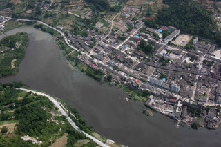 Photo taken on May 22, 2008 shows an aerial view of part of the Tangjiashan lake created by landslides in Beichuan county, Sichuan province. [Xinhua]