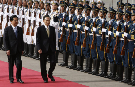 Chinese President Hu Jintao (L) and visiting South Korea's President Lee Myung-bak review the honour guard during a welcome ceremony outside the Great Hall of the People at Tiananmen Square in Beijing May 27, 2008. [Agencies]