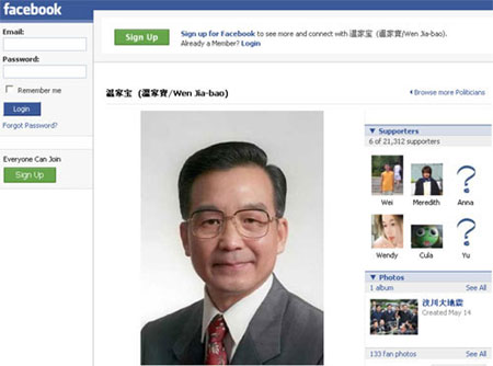 BEIJING -- Chinese Premier Wen Jiabao, hugely popular at home for his relief efforts following the massive earthquake in Sichuan, has emerged as the 10th most popular politician on the Facebook social networking site.