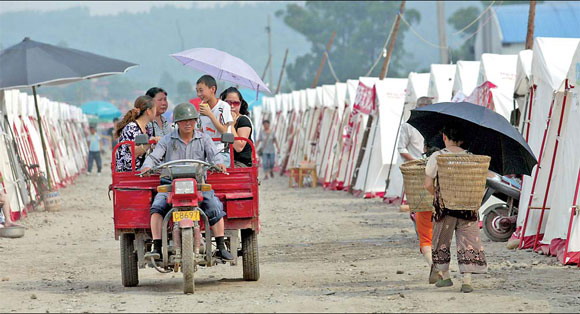 People ride through the Baosheng Road shelter in Qingyi, Sichuan province June 5, 2008. It is one of 252 resettlement zones close to the Tangjiashan. [China Daily]