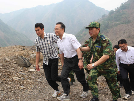Chinese Premier Wen Jiabao (center) walks towards the helicopter after a visit to the Tangjiashan quake lake dam to oversee the drainage preparations, in Mianyang, Southwest China's Sichuan Province, June 6, 2008. [Xinhua]