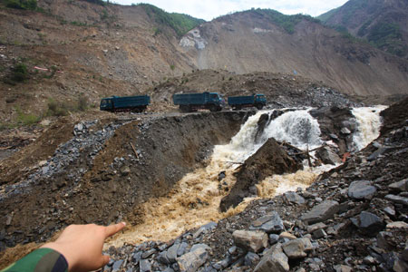 Water from Tangjiashan "quake lake" flows into a man-made sluice channel in Mianyang City, Southwest China's Sichuan Province, June 7, 2008. [Xinhua]