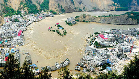 The muddy water flooded low-lying areas in the devastated Beichuan county, which had already been evacuated.