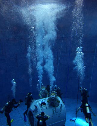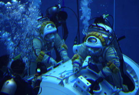 Chinese astronauts practice manoeuvring in a water tank designed to simulate the low-gravity environment of space. [Xinhua]
