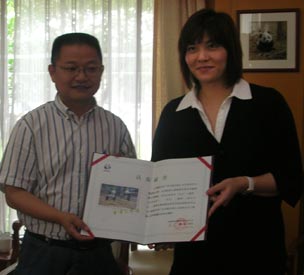 Zhuang Yong (right) receives the certificate showing her adoption of the two pandas from Zhang Zhihe, chief of the Chengdu Research Base of Giant Panda Breeding. [chinadaily.com.cn]