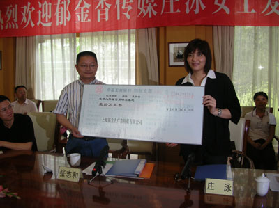 Zhuang Yong (right) gave Zhang Zhihe, chief of the Chengdu Research Base of Giant Panda Breeding, the bank cheque for her adoption of the two pandas. [chinadaily.com.cn/by Huang Zhiling]