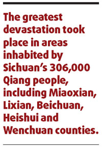 The greatest devastation took place in areas inhabited by Sichuan's 306,000 Qiang people, including Miaoxian, Lixian, Beichuan, Heishui and Wenchuan counties.