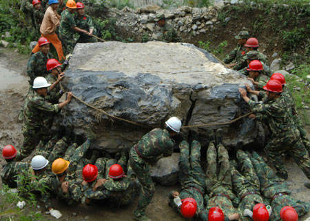 Soldiers remove a giant stone that may pose threat to public in Wudu Town of Jiangyou City, Southwest China's Sichuan Province, June 16, 2008. Roads are swamped by a massive landslide on Monday which left more than 1,000 peopel trapped without food supplies. It took three hours for the soldiers to clear the road. [Xinhua]