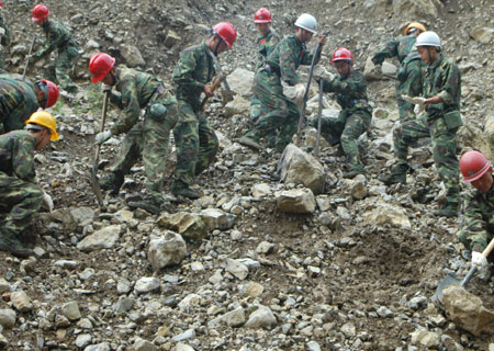 Soldiers clear up the dangerous stones that may pose threat to public in Wudu Town of Jiangyou City, Southwest China's Sichuan Province, June 16, 2008. [Xinhua]