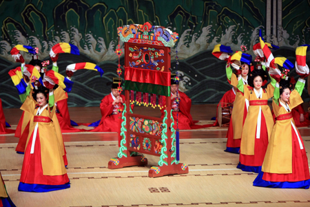Actors and actresses of the National Center for Korean Traditional Performing Arts (NCKTPA) play traditional Korean music on stage in Tianjin China Theatre in north China's Tianjin June 21, 2008. [Xinhua]