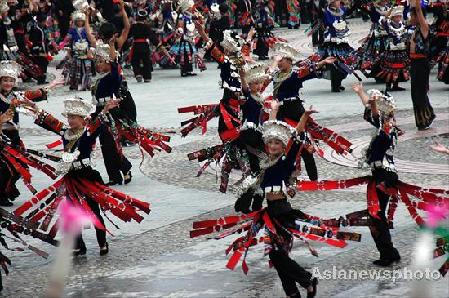 Dancers of the Miao ethnic group perform to the drum beat in Guizhou in this March 29, 2008 file photo. They, together with 25 other folk dance groups, were recently selected to perform prior to the opening ceremony of the 2008 Beijing Olympic Games in August. [Asianewsphoto]