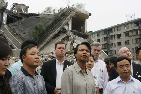 US Secretary of State Condoleezza Rice (C) looks at destroyed buildings during her visit at quake-hit Dujiangyan, Sichuan province June 29, 2008. [Agencies]