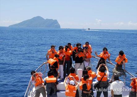 Visitors take photos while boarding a ship near the sea off Kueishantao in Taiwan July 5, 2008. A group of 760 Chinese mainland tourists started a historic journey to Taiwan last Friday and was warmly welcomed at every stop around the island. [Asianewsphoto] More photos