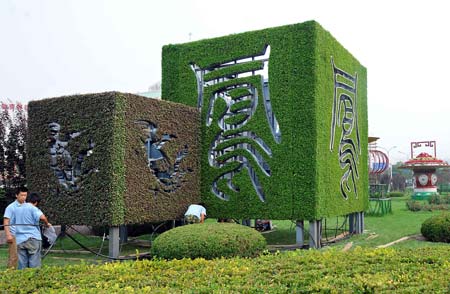 Laborers work on the parterre beside Chang'an Street in Beijing July 10, 2008. A large number of parterres have been erected on both sides of Chang'an Street, the most magnificent in Beijing, to decorate the Chinese capital ahead of the 2008 Olympic Games, to be held in August. [Xinhua]