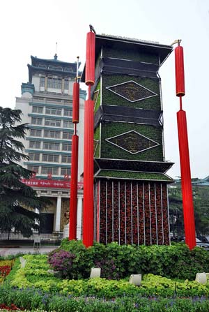 Photo taken on July 10, 2008 shows an ornamental parterre beside Chang'an Street in Beijing. A large number of parterres have been erected on both sides of Chang'an Street, the most magnificent in Beijing, to decorate the Chinese capital ahead of the 2008 Olympic Games, to be held in August. [Xinhua]