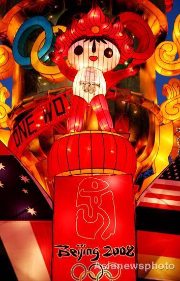 A Fuwa "Huanhuan" lantern is shown in this photo. A lighting event for the upcoming Olympics was held at Xuanwuhu Park, Nanjing, capital city of Jiangsu Province, July 20, 2008. More than ten groups of lanterns, which are about the Olympics and lotus, light up the sky and draw lots of visitors. [Asianewsphoto]