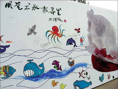 The official name of the piece is "Hands Across The Oceans" and it was commissioned for the Beijing Games' Cultural Festival. Wyland worked with a team of designers, as well as Chinese artists and children from local and international schools. "China faces a lot of environmental challenges, but the Olympics is a great opportunity for these issues to be addressed," he said. Monday, a group of Beijing youngsters helped put the finishing touches to the piece, adding colorful images of fish, whales and octopuses. "The animals look so happy, it's as though they are saying 'Do not disturb'," Sui Lei, who watched the mural's unveiling, said. Julia Zhou said she was delighted that her daughter Angie was selected to be part of the team of child painters. Although she and her husband moved to the United States when Angie was a baby, they flew back when Angie was selected. "The project is significant, and through it, Angie can contribute to society," Zhou said. Angie Zhou said: "It's meaningful seeing everyone do their part to care for the Earth." Other children expressed their thoughts. Yan Yi Chen, 11, said: "Water is precious. Without it, the fish I painted can't survive."