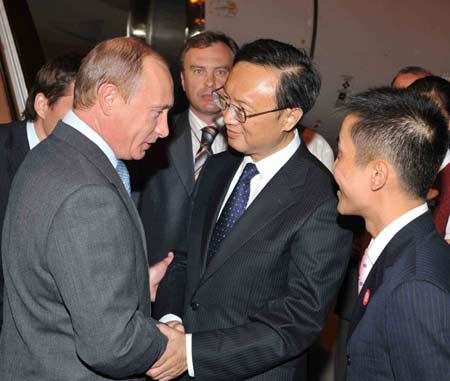 Russian Prime Minister Vladimir Putin (L) is welcomed by Chinese Foreign Minister Yang Jiechi (C) at the Beijing Capital International Airport in Beijing, China, Aug. 7, 2008. Putin arrived here Thursday to attend the opening ceremony of the Beijing Olympic Games and other events. [Xinhua/Reuters]