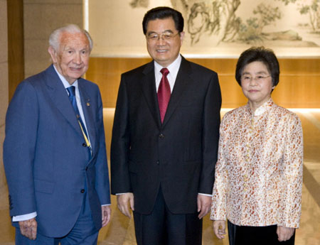 Honorary President of the International Olympic Committee (IOC) Juan Antonio Samaranch (L) poses with Chinese President Hu Jintao (C) and his wife Liu Yongqing prior a banquet at the Diaoyutai State Guesthouse on 24 August, 2008 in Beijing. 27 leaders from attended a banquet luncheon prior to the closing ceremony of the 2008 Beijing Olympic Games. [Agencies]