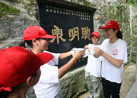 Students from the quake-hit Pingwu county in Mianyang, southwest China's Sichuan Province, drink the fountain at Donglin temple of Lushan Mountain in Jiujiang, southeast China's Jiangxi Province, Aug. 27, 2008. [Xinhua] |