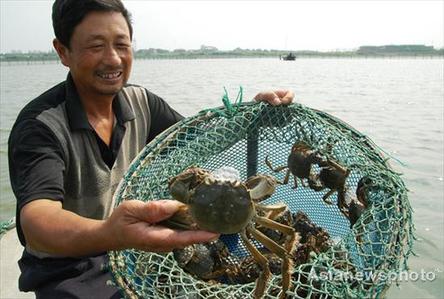 A fisherman holds a hairy crab in Yangcheng Lake, Suzhou, Jiangsu province on September 9, 2008. Officials with the local fisheries administration measured the catch as a presursor to the start of the hairy crab season on September 28. [Asianewsphoto]